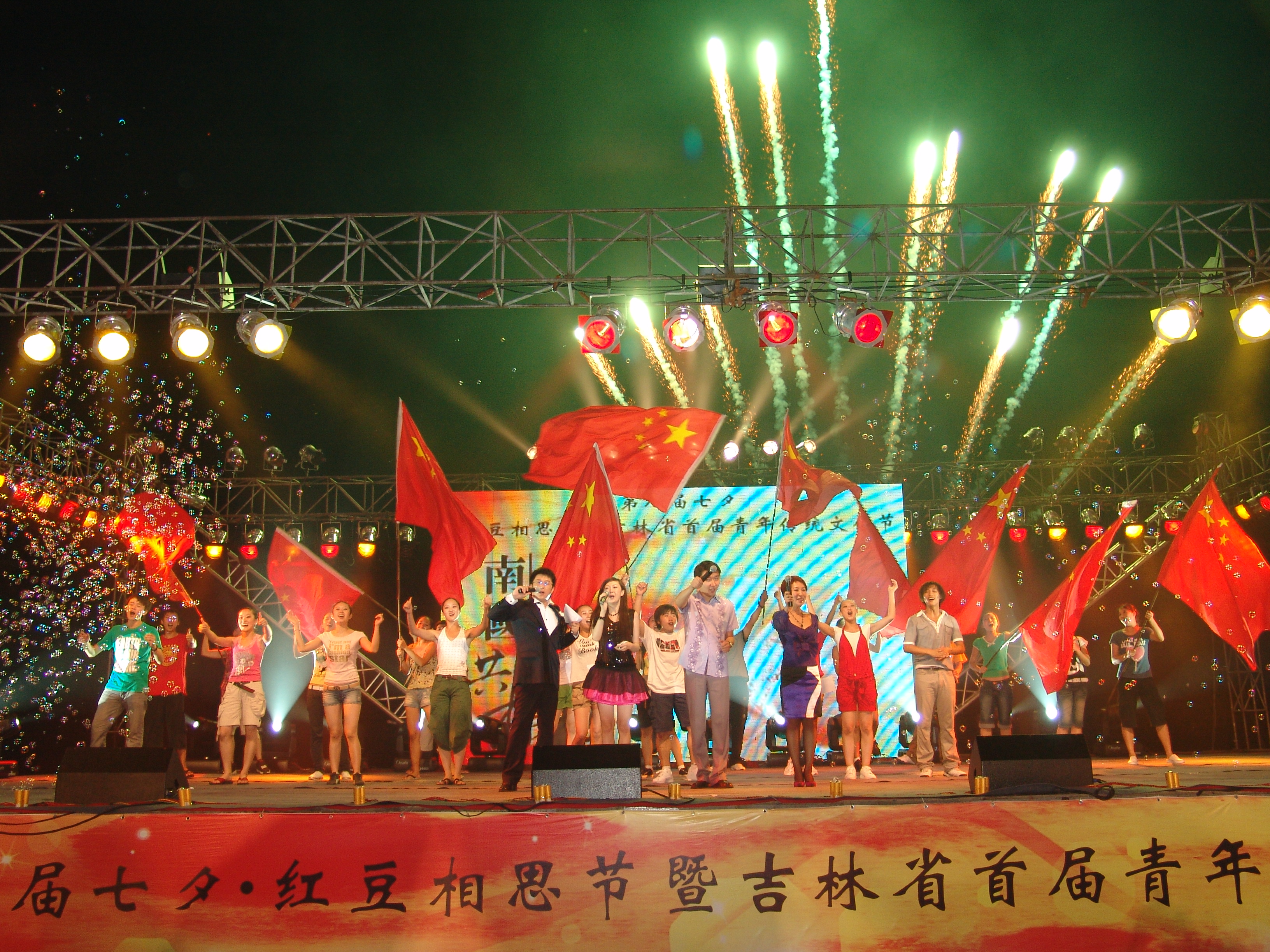 傳統(tǒng)七夕節(jié)(8月7日)這一天晚上,長(zhǎng)春市文化廣場(chǎng)歌聲陣陣,音樂(lè)滿天,到處可見(jiàn)心形的氣球、鮮紅的玫瑰,一盞盞心愿燈緩緩升起,這里正在舉辦第八屆七夕·紅豆情人節(jié)暨吉林首屆青年傳統(tǒng)文化節(jié)。首推七夕·紅豆情人節(jié)的周耀庭在這次活動(dòng)中高興地說(shuō)“紅豆集團(tuán)原本計(jì)劃要用5個(gè)5年的時(shí)間推廣七夕節(jié),但現(xiàn)在看來(lái)這個(gè)時(shí)間要提前了。” 這次活動(dòng)由共青團(tuán)吉林省委、吉林省青年聯(lián)合會(huì)、紅豆集團(tuán)、吉林電視臺(tái)、城市晚報(bào)社、長(zhǎng)春交通之聲共同舉辦,共青團(tuán)吉林省委書(shū)記謝忠?guī)r,九屆、十屆全國(guó)人大代表、紅豆集團(tuán)董事局主席周耀庭等領(lǐng)導(dǎo)出席了這次活動(dòng)。文化廣場(chǎng)上人山人海,有20000多名長(zhǎng)春市民積極自愿參加這次活動(dòng),快樂(lè)的度過(guò)了美麗的七夕。