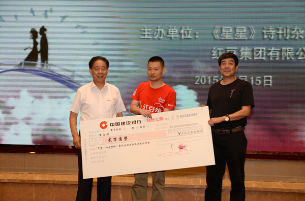 為了進(jìn)一步繁榮愛(ài)情詩(shī)創(chuàng)作,弘揚(yáng)正確愛(ài)情觀,特別是推動(dòng)中國(guó)當(dāng)代愛(ài)情詩(shī)再度輝煌,2014年7月1日,由《星星》詩(shī)刊雜志社與紅豆集團(tuán)聯(lián)合啟動(dòng)了“中國(guó)?紅豆絨杯”當(dāng)代愛(ài)情詩(shī)大獎(jiǎng)賽征文活動(dòng),作為紅豆七夕節(jié)的一項(xiàng)重要活動(dòng)?,F(xiàn)在經(jīng)過(guò)一年的征集及后期評(píng)選,在今年七夕——中國(guó)情人節(jié)前夕頒獎(jiǎng)。