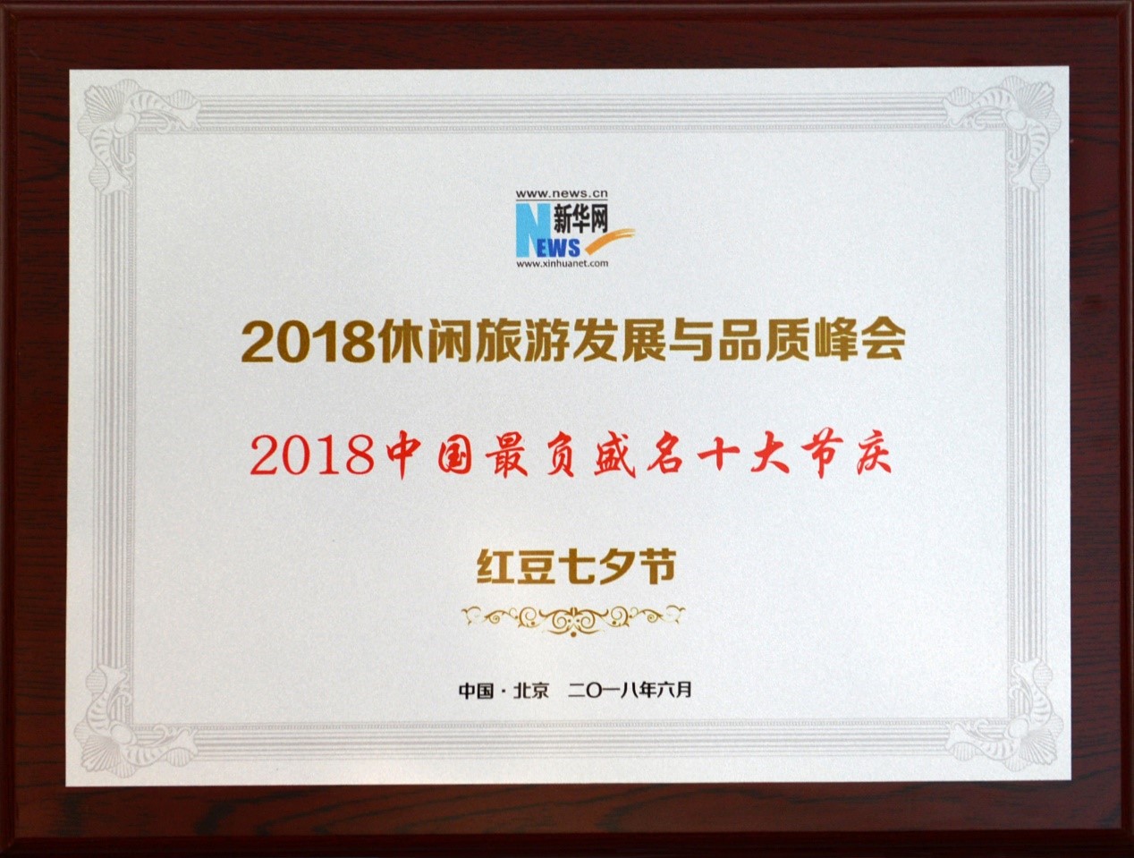 ? ? ? ? ?打造“美麗中國”,共創(chuàng)“美好生活”,6月24日,由新華通訊社主辦的“2018休閑旅游發(fā)展與品質(zhì)峰會(huì)”在北京召開。峰會(huì)發(fā)布了“首批國民休閑旅游勝地、年度旅游匠心企業(yè)品牌、2018中國最負(fù)盛名節(jié)慶(節(jié)會(huì))”名單?!凹t豆七夕節(jié)”榮膺“2018年最負(fù)盛名十大節(jié)慶”。