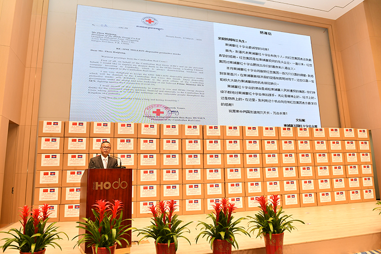 周海江在儀式上表示,在習(xí)近平總書記的親自指揮、親自部署下,我們舉國上下同心抗疫,經(jīng)過60多天的艱苦奮斗取得階段性勝利。而在中國抗疫斗爭初期最艱難時刻,洪森首相不顧危險,親赴北京,雪中送炭,支持中國抗疫,體現(xiàn)了危難之際中柬兩國的深厚兄弟情誼。多年來,在洪森首相的英明領(lǐng)導(dǎo)下,柬埔寨經(jīng)濟發(fā)展迅猛,現(xiàn)在柬埔寨疫情防控進入攻堅期,作為在柬投資的中國龍頭企業(yè),紅豆集團用實際行動誠摯表達中國人民對洪森首相英明領(lǐng)導(dǎo)的一份敬意。