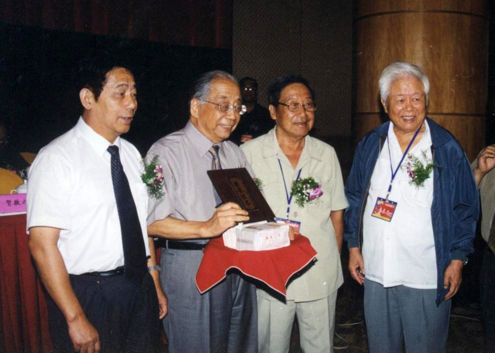 文化部原代部長、著名詩人賀敬之(右二),原中華詩詞學(xué)會會長孫鐵青(右一),紅豆集團(tuán)創(chuàng)始人周耀庭(左一)為劉征(左二)頒獎
