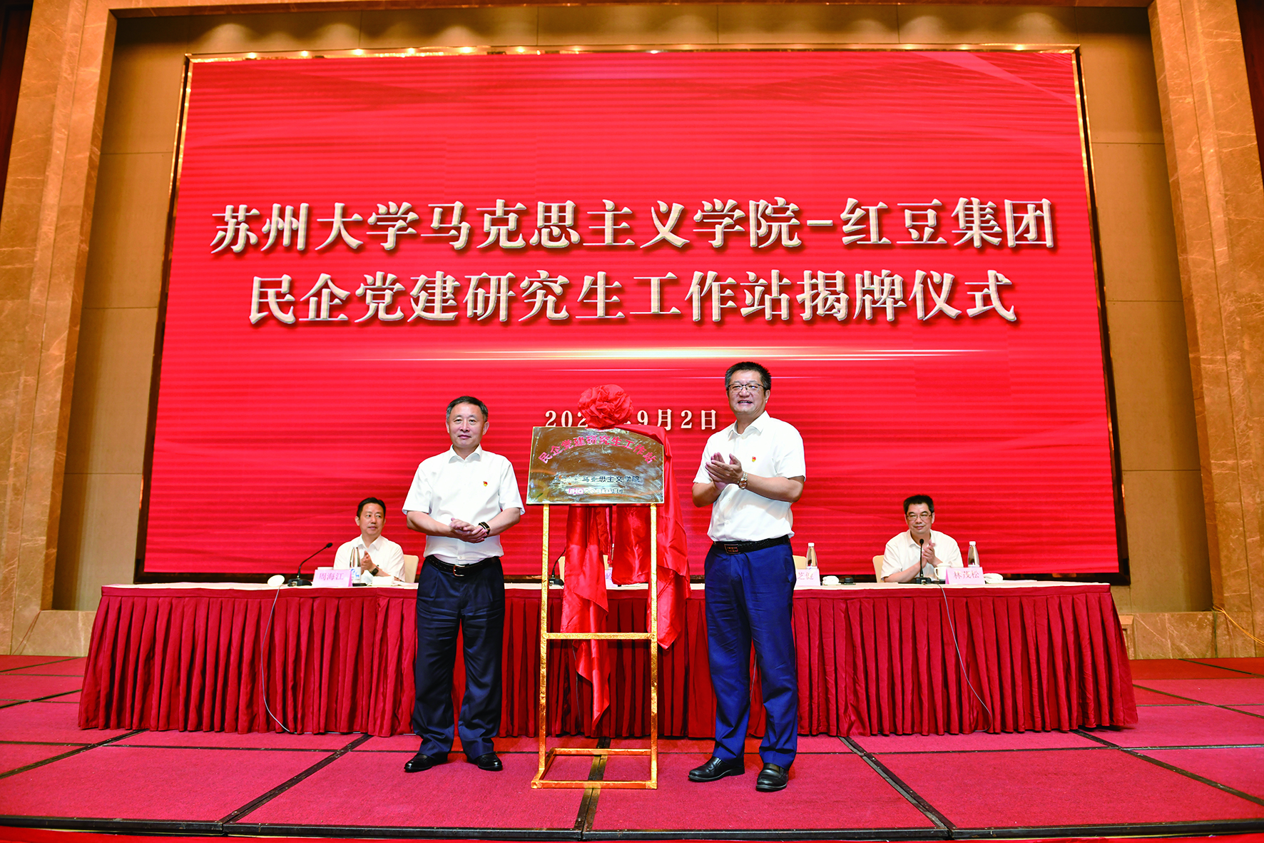 9月2日,無錫市“兩新”組織黨組織書記示范培訓(xùn)班在紅豆集團開班。開班式上,蘇州大學(xué)馬克思主義學(xué)院—紅豆集團民企黨建研究生工作站揭牌成立,無錫市委常委、組織部部長柏長嶺和蘇州大學(xué)馬克思主義學(xué)院院長田芝健共同揭牌。